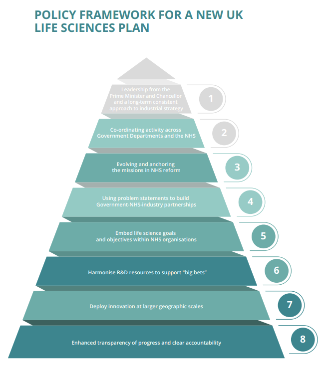 industrial strategy. The new Government, led by the Prime Minister and Chancellor, should use the creation of a new life sciences plan to set-out ambitions for building a life science ecosystem that delivers, and co-ordinates action, so it brings both economic growth and improved health outcomes for the UK.